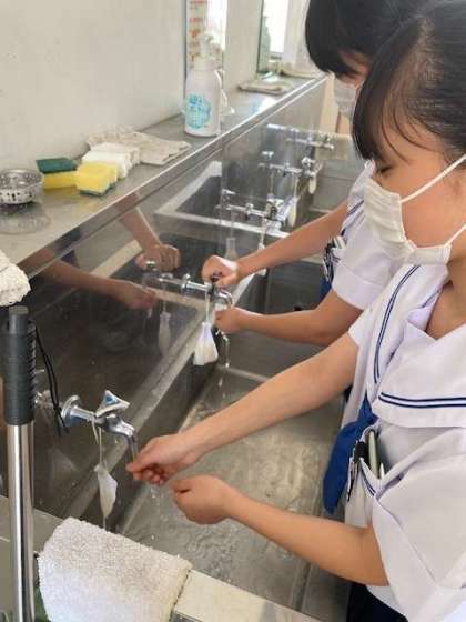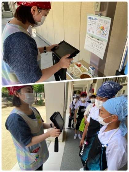 給食当番に、今日のサンプルをタブレット端末で撮影して生徒たちに見せています。
