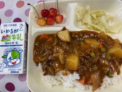 今日の給食メニューは、ハヤシライス・キャベツのゆずドレッシング・さくらんぼ・牛乳です。とっても美味しそうです!