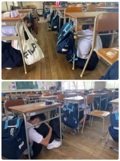 まず、机の下に潜って身を守る行動をとり、グラウンドへ移動します。