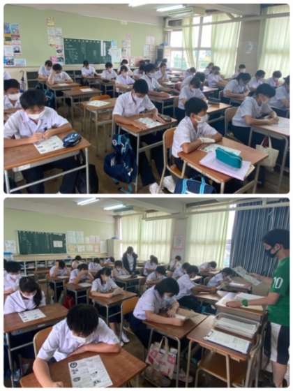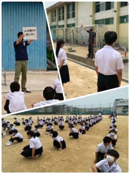 各学年の集合点呼完了のタイムは、1年生 3分31秒、2年生 2分31秒、3年生 3分でした。学級に戻ってから、プリントを使って振り返りをしています。