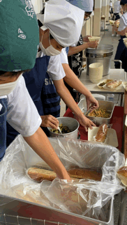 給食当番を行う生徒及び教職員は、衛生的な服装で手指を確実に消毒しているかを毎日点検しています。配食にあたっては、各個人では行わず、給食当番が行っています。