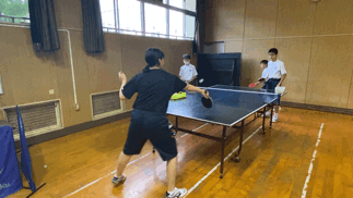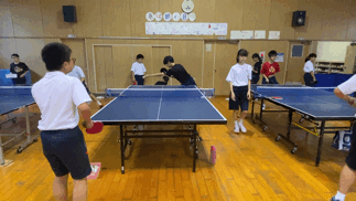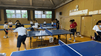 格技室では、卓球部が活動しています。大人数で限られた卓球台を使うこととなるため、時間を区切って練習メニューに取り組んでいます。集中力を高め、技術の向上と部活動の意義を学んでいます。