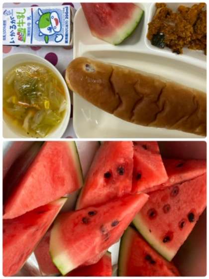 今日の給食メニューは、おさつパン・かぼちゃのミートグラタン・スープ・すいかです。