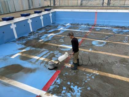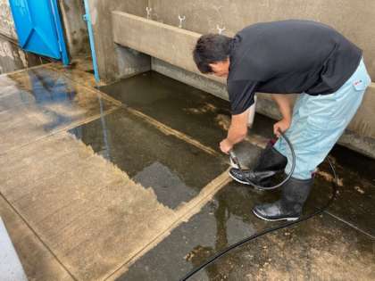 今日は、テスト期間を活用して、プール清掃を行っています。1年ぶりのプールサイドの汚れが高圧洗浄機できれいになっていきます。