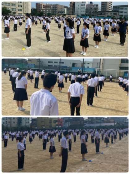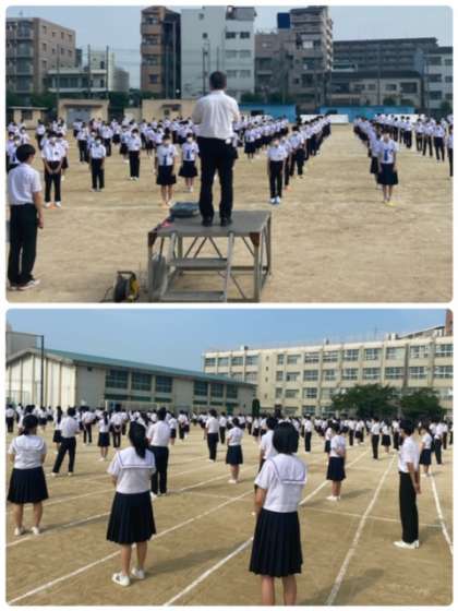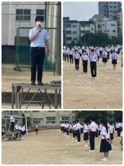 本日、今年度初めての全校集会をグラウンドで行いました。