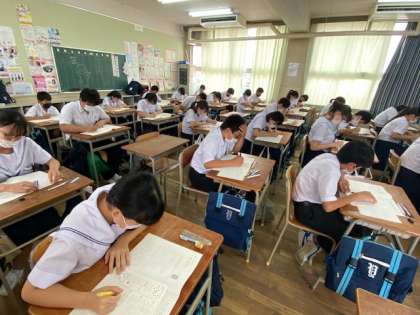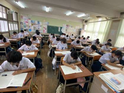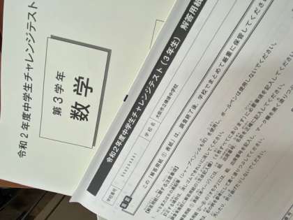 3年生の数学の授業です。今年度、実施されなかったチャレンジテストを活用しています。問題に慣れることと今の自分がつまづいているところを確認します。正誤はもとより、理解度についても自分で振り返りましょう。