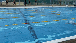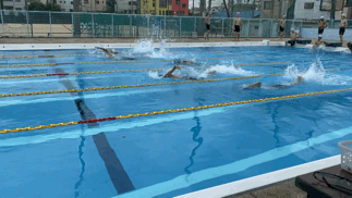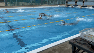 クロールで25メートルを泳いでいます。曇り空だからでしょうか、陸上より水中の方が温かいようです。