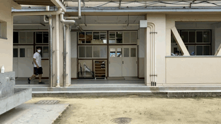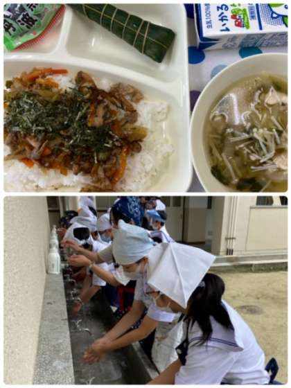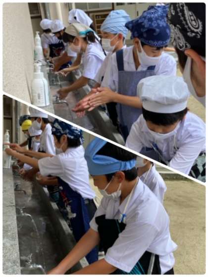 給食の前には、しっかり手洗いを行っています。生徒たちが1列に並んで、石けんで泡立てて洗浄しています。