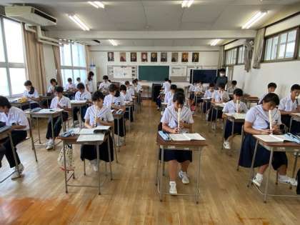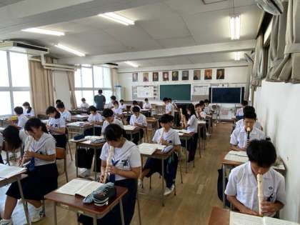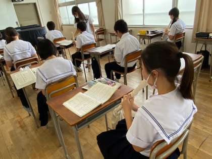 リコーダーの練習を行っています。まず運指の確認をして、それから各自で吹奏練習をしています。ピアノ伴奏に合わせて、みんなで一斉に吹くと、きれいな音色を奏でます。