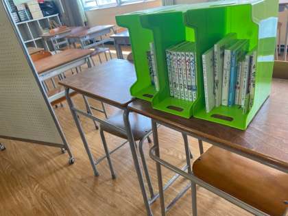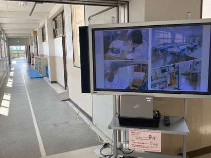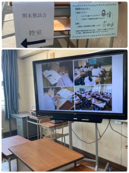 期末懇談会に来ていただく保護者の方に、さまざまな対策を行っています。冷房のある控室を準備したり、読書や進路資料を提示したり、大型モニターで生徒たちの様子を見せたりしています。