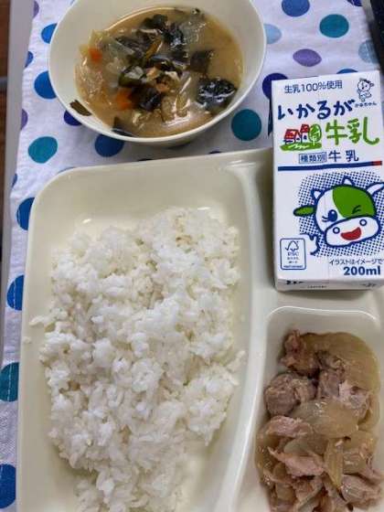1学期最後の給食です。今日のメニューは、豚肉のしょうが焼き、みそ汁、ごはん、牛乳です。