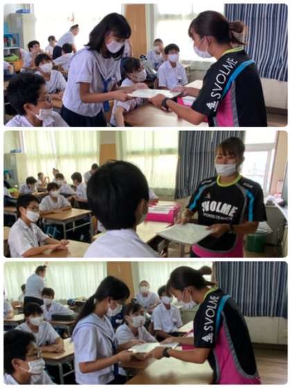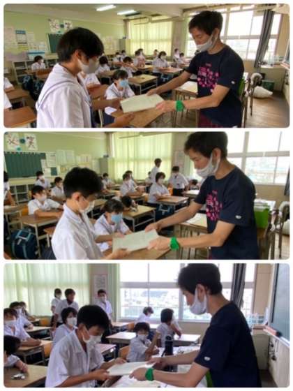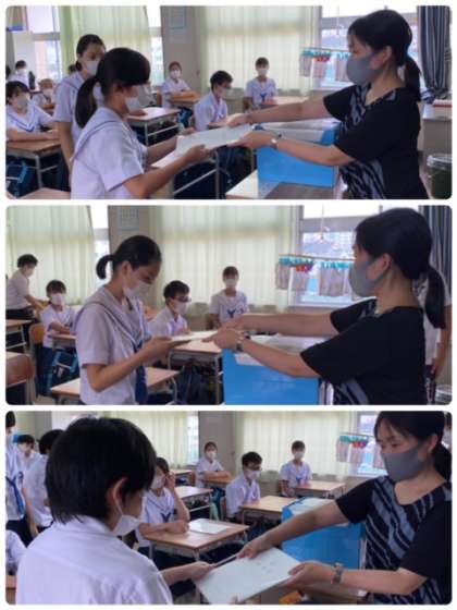 終学活で、担任の先生から通知表を受け取っています。