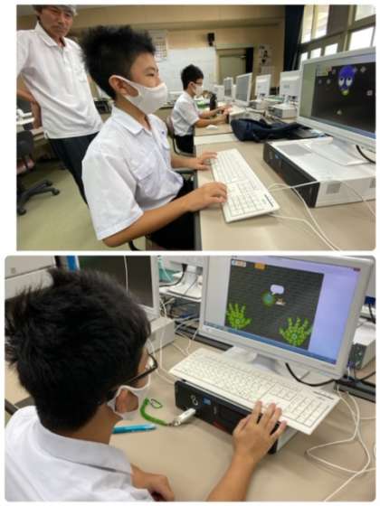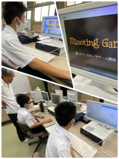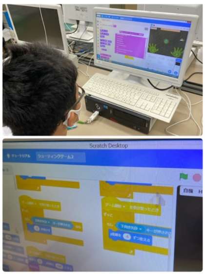 Scratchのソフトを活用して、ブロックを組み立ててオリジナルのゲームを作成しています。パソコン操作がとてもスムーズで、見ているだけでも面白いです。