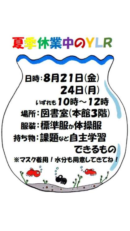 生徒のみなさん!夏休みの課題は、すべて終わりましたか?まだ終わっていないという、そこの君!明日、YRL学習会を実施しています!是非参加しましょう!