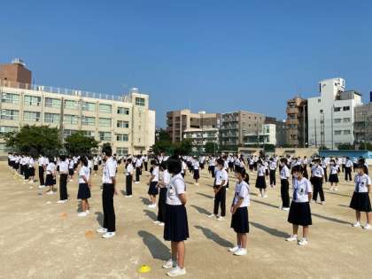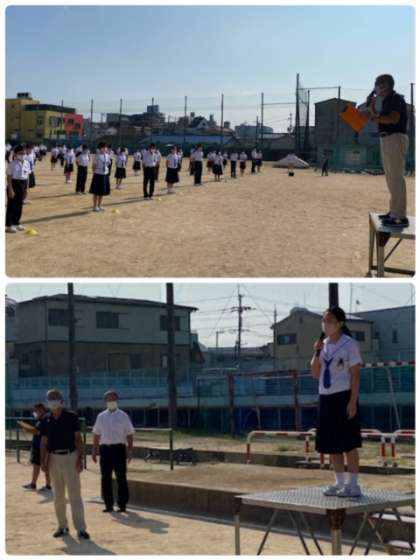 今日から2学期がはじまりました。新型コロナウイルス感染症対策のため、グラウンドで間隔を空けて始業式を行っています。正しくコロナ対策をしながら、2学期のさまざまな行事に取り組んでいきましょう!
