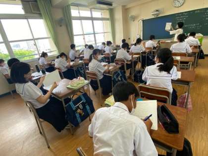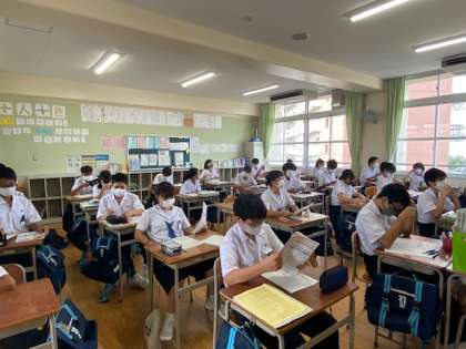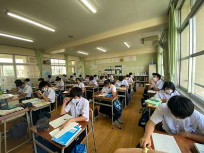 2年生の2学期最初の授業です。既にお知らせしているとおり、ブロック化による学校支援事業において、2年生全員対象に英語検定が受検できることとなりました。また、2学期から習熟度別少人数授業も実施しますので、学習をがんばりましょう!