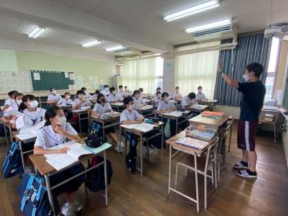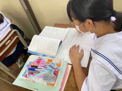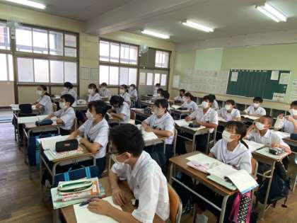 1年生の2学期最初の授業です。数学では、基礎・基本を定着させて、数学的な技能を確実に習得させることが授業の中心となります。授業のねらいを明確に提示して、達成するように取り組んでいます。