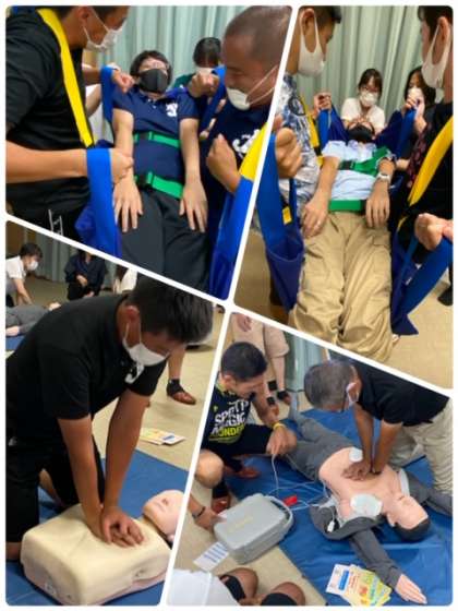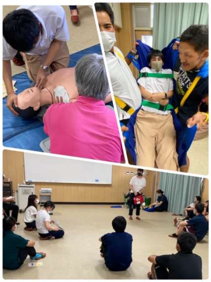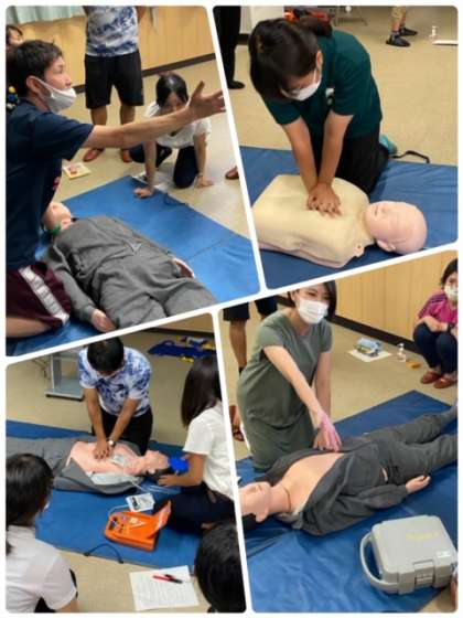 その後、全員がAEDや心肺蘇生の研修を行いました。疾病者を発見したら、安全を確認して、命を助ける行動を行います。学校ではもちろん、街中で遭遇した場合も行動できるように、一人ひとりしっかり真剣に取り組みました。