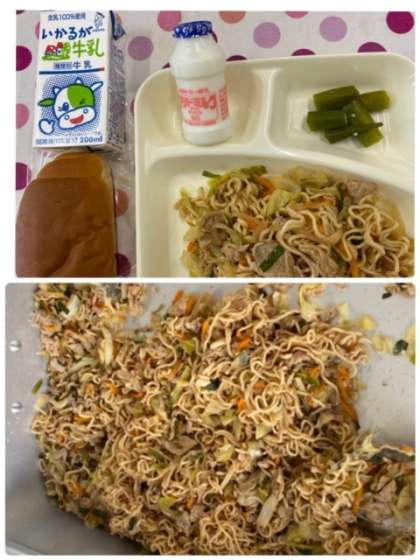 今日の給食メニューは、オイスターソース焼きそば、オクラの甘酢あえ、パン、牛乳、発酵乳です。