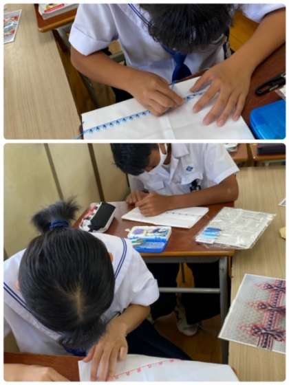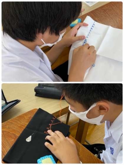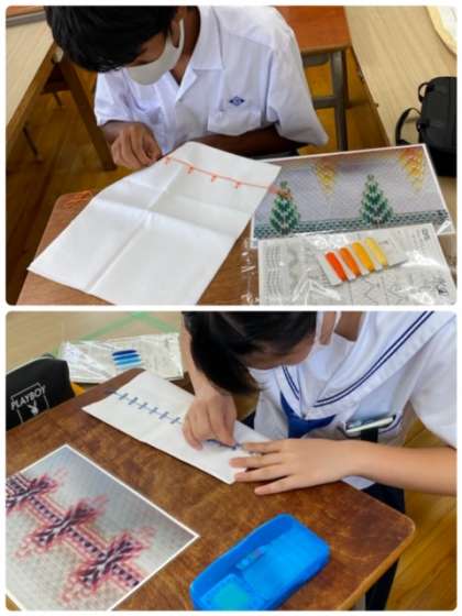 2年生の家庭科の授業では、スウェーデン刺繍の学習を行っています。一針一針進めていくと、模様が浮かび上がってきます。丁寧に縫い進めて、できあがりが楽しみです。