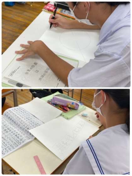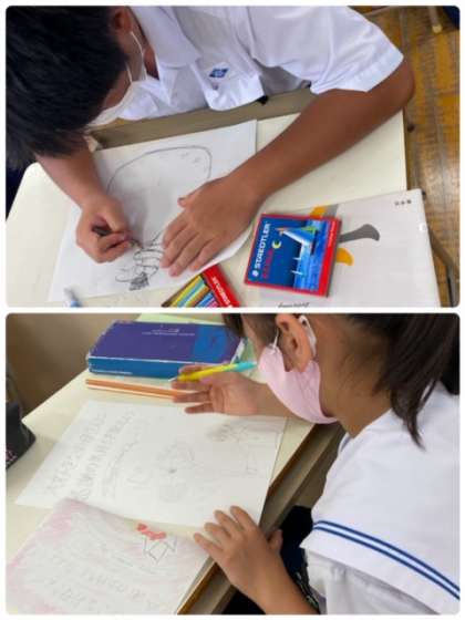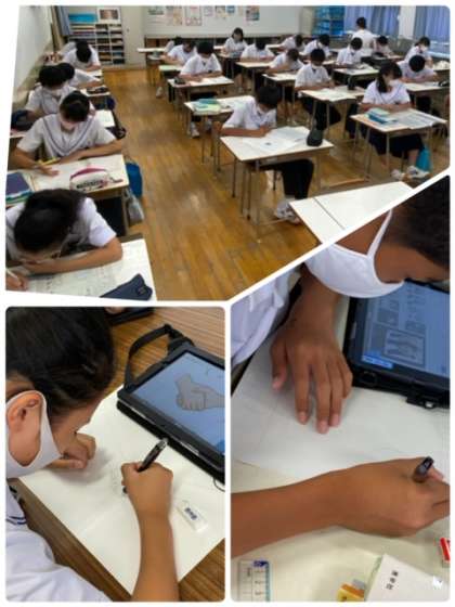 自分で考えたキャッチフレーズをレタリングしたり、タブレット端末で調べた絵を描き写したりしています。