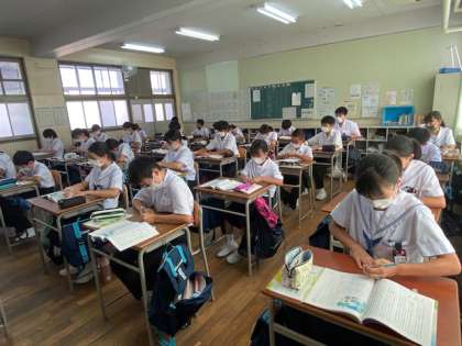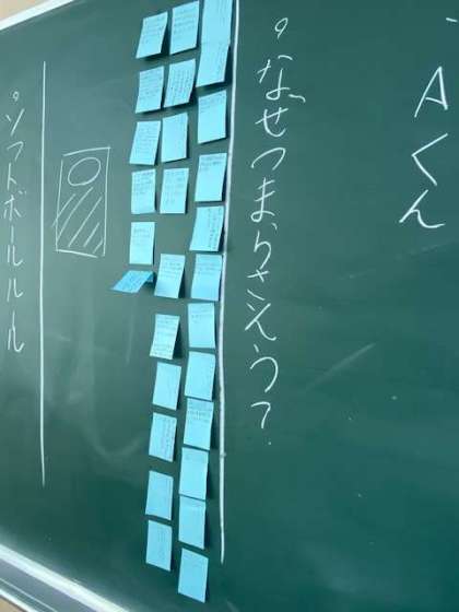 教材「ある日のバッターボックス」を題材にして、正義と公正さを重んじ、公平な社会をつくることをねらいとしています。各自の意見を付箋に書いていくように工夫されています。