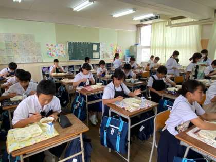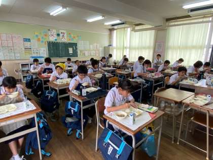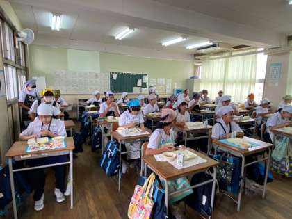 今日も元気な1年生は、もりもり給食を食べています。配膳当番さんは、学級人数分ぴったりに盛り分けられたときに達成感を得られるようです。