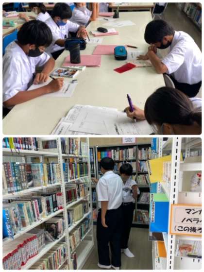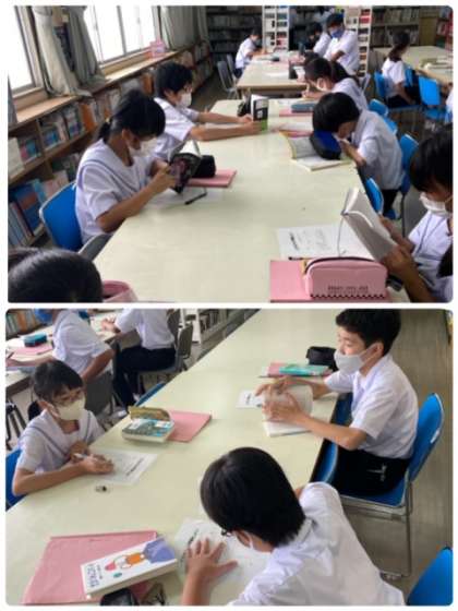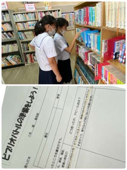 ビブリオバトルの本を選んだり、本についてのアピール文を考えたりしています。図書室には、いろんな種類の本があるので、個性豊かな選書を期待しています。