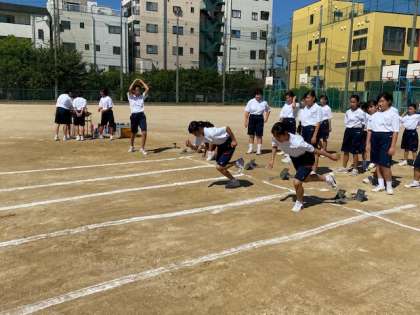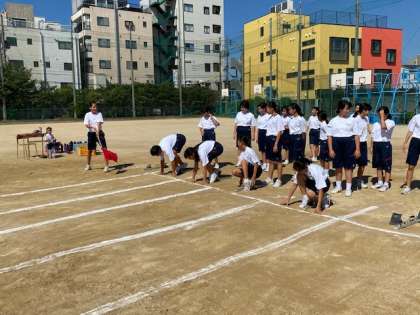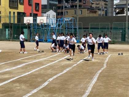 1年生の女子保健体育では、グラウンドで50m走の測定を行っています。