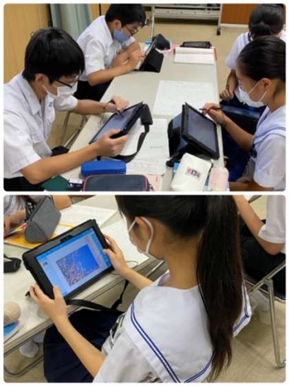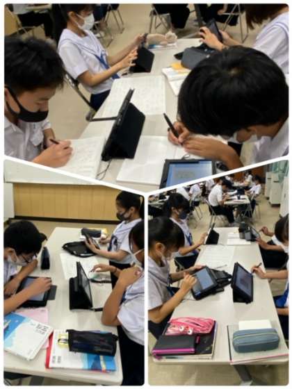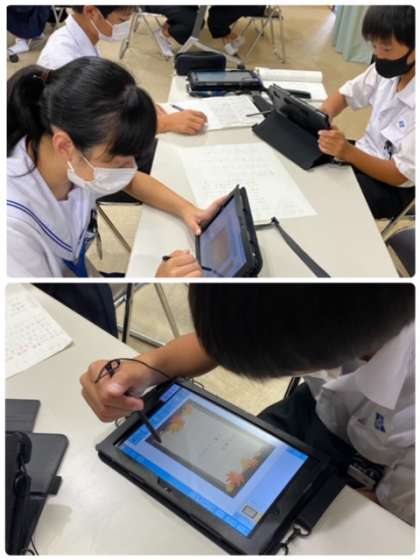 3年生の国語では、創作俳句をタブレット端末で作っています。発表するために、背景を工夫したり、季語を検索したりしています。