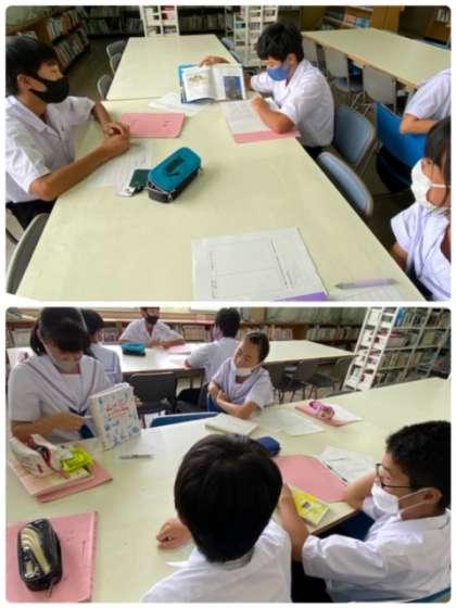 今日は、班でそれぞれの本の紹介を行い、代表を決めます。物語の内容や資料本の特徴など、さまざまな視点で発表しています。
