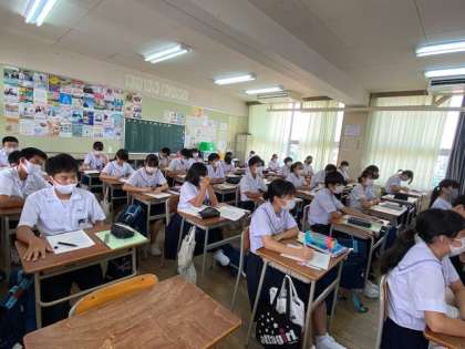 3年生の英語の授業です。現在完了形の学習を行っています。日本語の過去形と英語の現在完了形では少し違いがあり、文法理解への説明を丁寧に行っています。