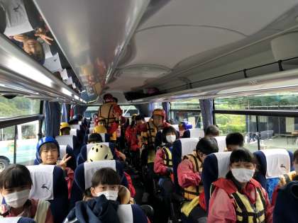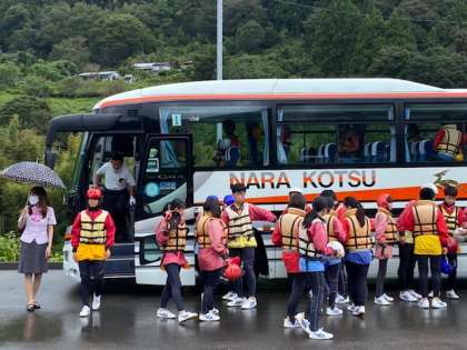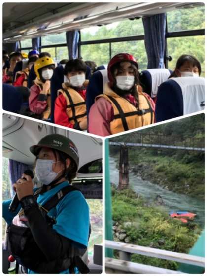 吉野川に到着し、水着とライフジャケットに着替えました。バスでインストラクターさんの説明を受け、上流からラフティングを行います。