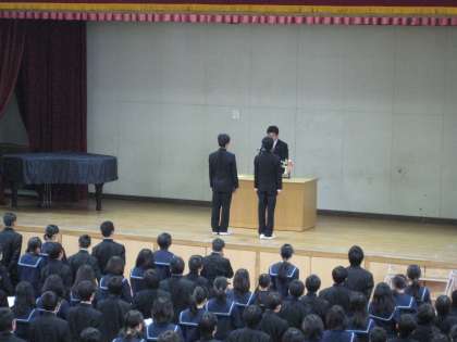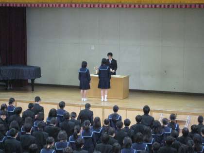 校長講話の後、城東納税貯蓄組合連合会「税についての作文」で表彰された3年生の吉岡朋美さん・寺田百華さん、鶴見区青少年指導連盟「学校生活標語」で表彰された2年生の衛藤遼佑君、茨田カップで優勝したサッカー部、ガバナーズカップ鶴見区予選男子1年の部準優勝の卓球部・外崎裕也君の表彰伝達を行いました。