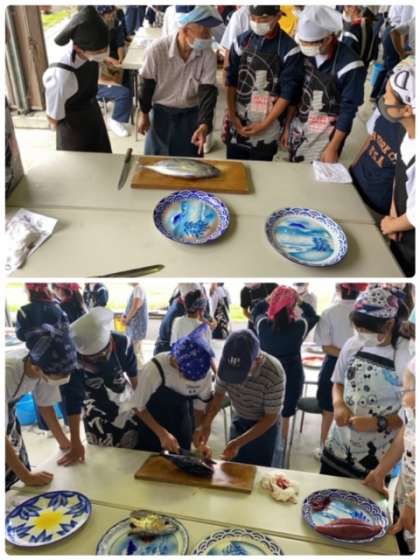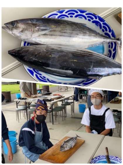 立派なかつおを包丁でさばいていきます。血抜きをして、おろしていきます。積極的に取り組む姿がみられます。