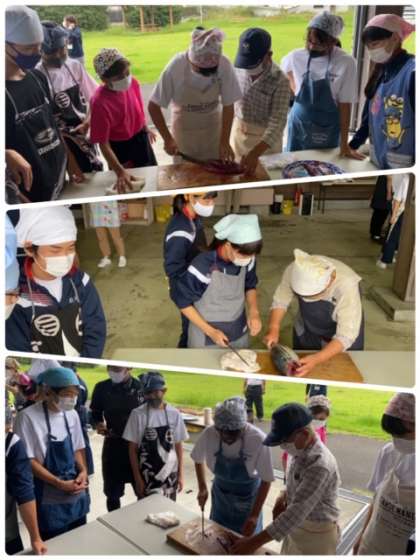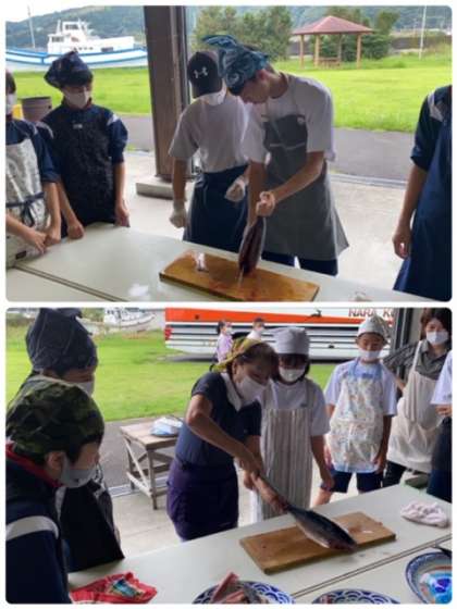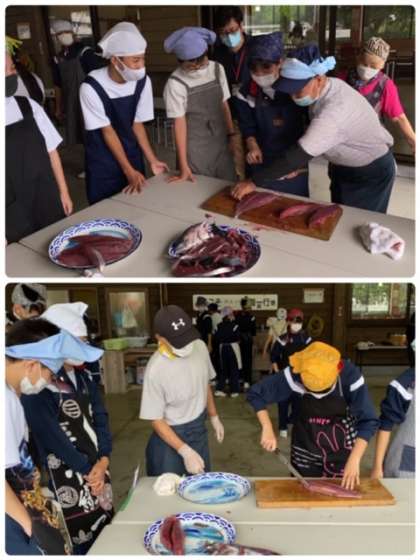 手ほどきを受けながら、初めて魚をさばく生徒たちは真剣な表情です。