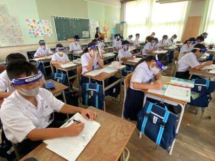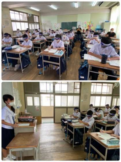 発表者は前に立って英語でスピーチを行い、聞いている生徒たちはフェイスシールドをして評価シートに記入しています。