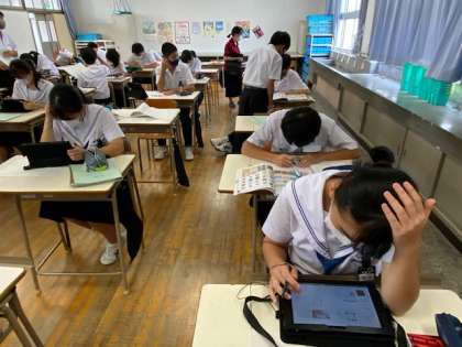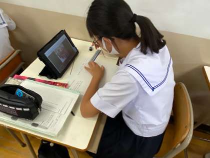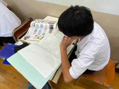 3年生の美術の授業では、木彫額のデザインを行っています。タブレット端末で画像を調べたり、教科書から発想を膨らませたりしています。どんな模様で、どう工夫して彫っていくかが楽しみです。