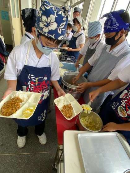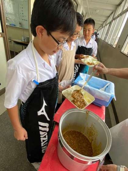 1年生の給食当番さんたちが、配膳しています。美味しそうなカレーの香りに食欲がわいてきます。