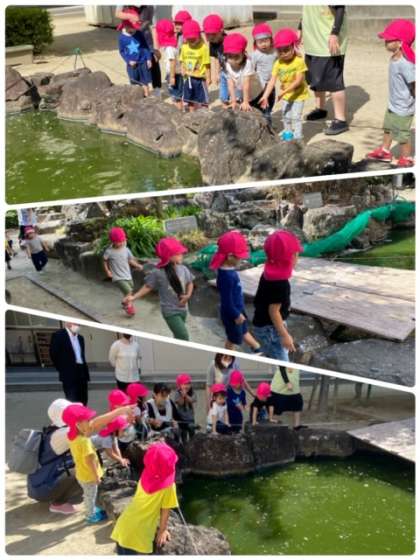 今日は、3歳児のみなさんが中庭を散策しに来られました。鮮やかな帽子をかぶり、手をつないで歩いてくる姿は本当に可愛らしいです。隣接していますので、今後も連携や交流を行ってまいります。