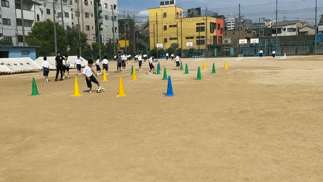 球技においては、安定したボール操作と空間を作り出すなどの動きを学びます。ジグザグドリブルをして、ボールさばきができるようにしています。