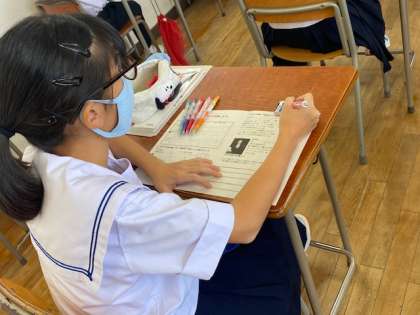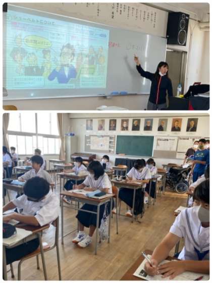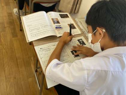 1年生の音楽の授業の様子です。鑑賞の単元を学習しています。ICT機器を活用して、教材を提示しています。このように特別教室においても、生徒たちの学びの質を向上させるように工夫しています。