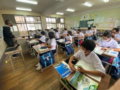 1年生の社会の授業の様子です。黒板に巨大地図を掲示して学習しています。
