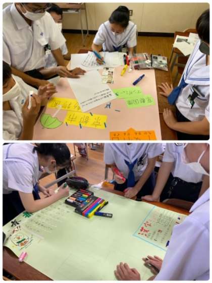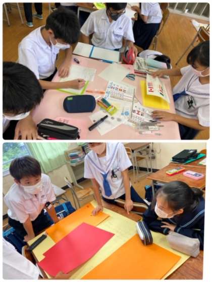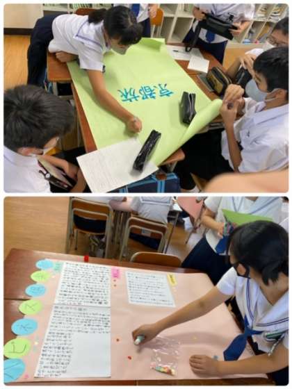 色画用紙でテーマごとにまとめたり、タブレット端末で撮影した写真を切り抜いたりして、見やすいような工夫をしてまとめています。
