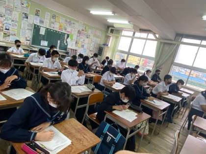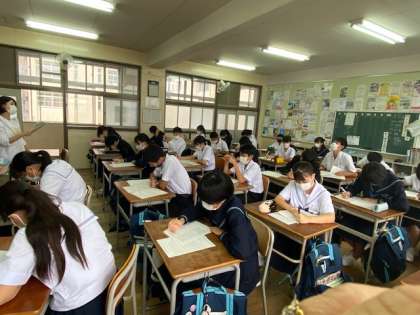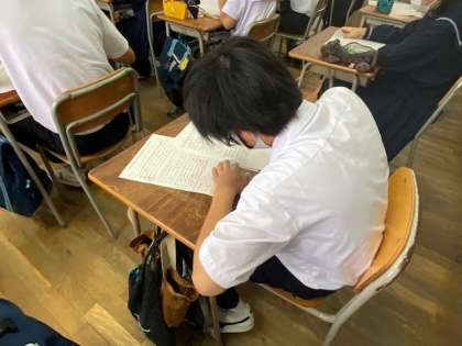 3年生の英語の授業です。英語は4技能の習得が必要であり、英単語などの基礎・基本的事項の定着も大切です。一夜漬けでできる教科ではないので、毎回の授業で学習する内容をしっかり学びましょう。