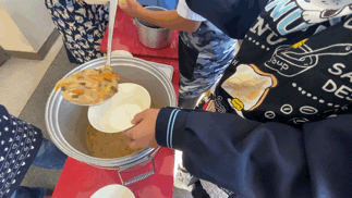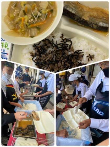 今日の給食メニューは、ごはん、さんまのみぞれかけ、みそ汁、牛ひじきのそぼろ、牛乳です。