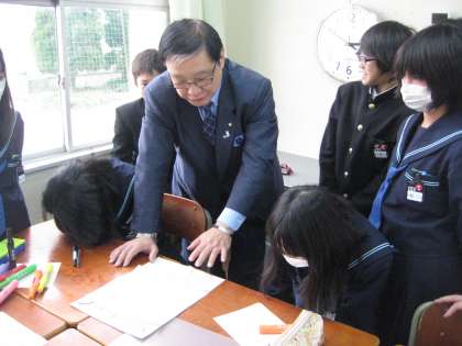 畑山氏に加え、鳥取市の日本海新聞・編集制作局・編集センター長・大西俊章氏、日本海新聞・参事・論説委員・森原昌人氏にも加わっていただき、各教室で新聞づくりの指導をしていただきました。
