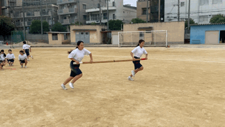 学年種目は、台風の目です。1本の棒を2人でポールを回り、足元ジャンプや頭上を通してバトンタッチです。クラスの団結をみせて頑張ろう!