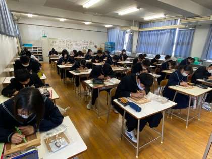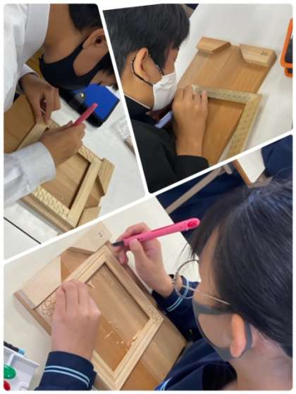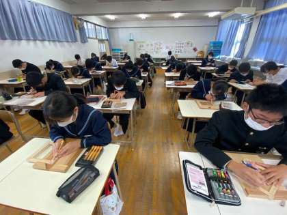 3年生の美術の授業です。木彫プレートの彫刻作業に進んでいます。自分でデザインした模様に深浅をつけて表現していきます。