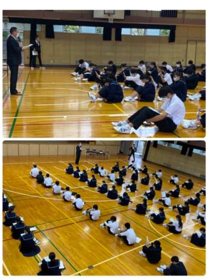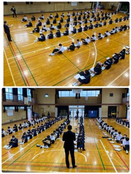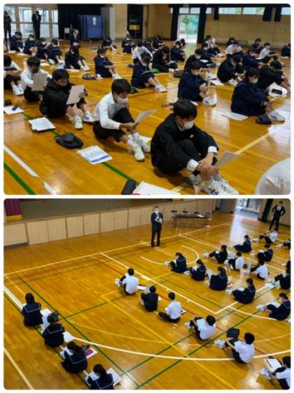 6限目の3年生は、進路学習を行っています。大阪産業大学付属高等学校から前川先生に来ていただき、「公立高校と私立高校の違いについて」ご説明いただいております。